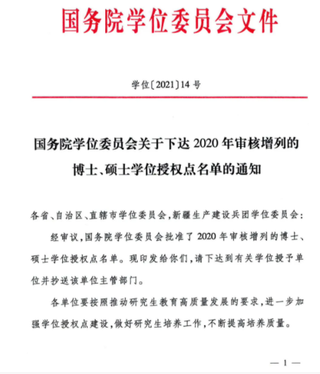近日,国务院学位委员会发布了《2020年审核增列的博士、硕士学位授权点名单》(学位[2021]14号),我院申报的法律硕士专业学位授权点正式获批,实现了我院硕士学位建设的突破,法学学科建设迈上了一个新的台阶,教学与科研有了更高的平台。