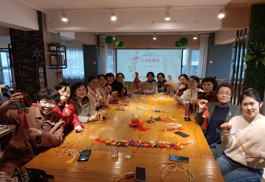 随后,老师们来到学校新华书店继续第二站“巧手编制中国结,合力凝聚中国心”活动,一边品味书香,一边体验中华传统手工文化。老师在编绳过程中互帮互助,经过1个多小时的操作与交流纷纷做出了心仪的工艺品。此次活动,不仅给老师们提供了一个相互学习、相互交流的平台,更提高了老师们的审美能力和对艺术的鉴赏能力,让老师们发挥兴趣特长,一起交流编织技艺,在促进同事感情的同时也感受到了传统文化的乐趣。