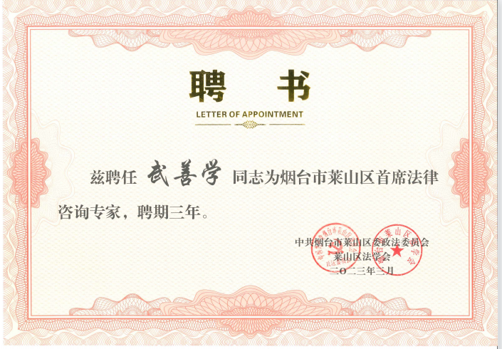 首席法律咨询专家制度是贯彻落实习近平法治思想,服务法治实践、服务基层群众的具体行动。武善学副教授表示将认真履职尽责,全力聚焦党委政府关注的重大问题,就重大决策论证、重大风险防控、重大矛盾调处、重大信访积案化解等方面提供专业意见,努力为建设务实开放、生态和谐、美丽富裕现代化新莱山的法治保障献智献策。
