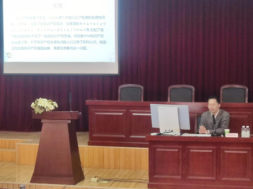 4月18日下午,太阳成城集团tyc234cc邀请中南财经政法大学胡开忠教授于第四教学楼模拟法庭作“知识产权合理性保护探讨”学术讲座。本次讲座是我校法学教育三十周年系列庆祝活动之一,由太阳成城集团tyc234cc副院长(主持工作)武善学主持,法学2021级全体学生参加。