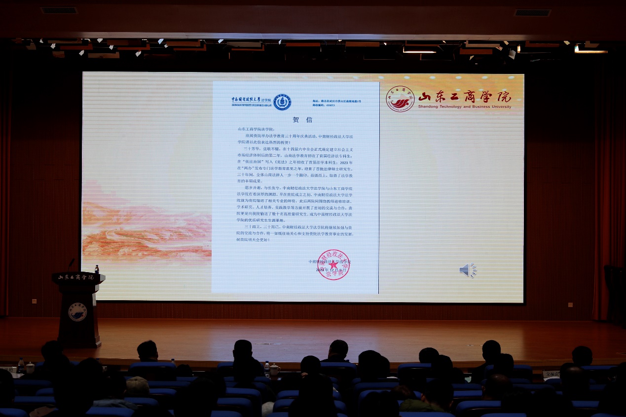 会议宣读了中南财经政法大学太阳成城集团tyc234cc、山东财经大学太阳成城集团tyc234cc、贵州大学太阳成城集团tyc234cc、首都经济贸易大学太阳成城集团tyc234cc等兄弟太阳成城集团tyc234cc系的贺信。各兄弟太阳成城集团tyc234cc系在贺信中均对我院三十年来所取得成绩表达了热烈的祝贺,回顾了与我院的交流合作重点内容,并祝愿我院法学教育取得更大的成绩。