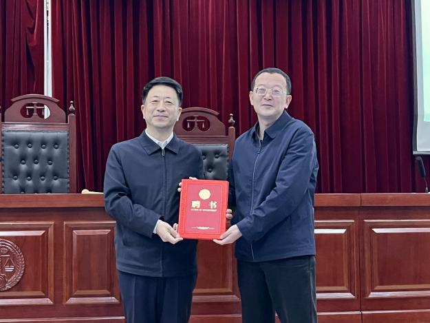2024年12月12日下午,法律硕士德育导师聘任仪式在模拟法庭顺利举行。党的二十大代表、山东三和德通律师事务所党支部书记、山东省律师协会副会长、烟台市律师协会会长杨希勇受聘为法律硕士德育导师,武善学院长为杨主任颁发了聘书。