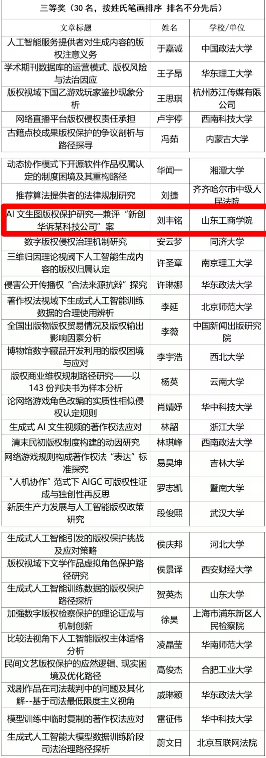 近日,由中国版权保护中心指导、中国版权杂志社主办、中华版权服务有限公司协办的“第七届新时代版权强国青年征文活动”评审结果揭晓。本届活动经过宣传、征稿、初审、终审、公示,最终产生一等奖10名、二等奖20名、三等奖30名、组织奖7名。获奖者来自清华大学、中国政法大学、浙江大学、吉林大学、武汉大学、西南政法大学、中南财经政法大学、北京互联网法院等高等院校和实务单位。我院武善学教授指导的2023级研究生刘丰铭提交的论文《AI文生图版权保护研究—兼评“新创华诉某科技公司”案》荣获三等奖,指导教师为武善学教授。
