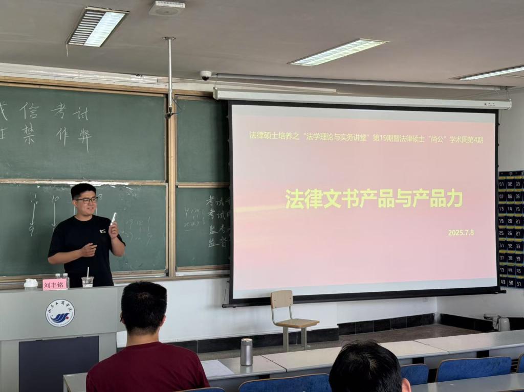 7月8日下午,法律硕士培养之“法学理论与实务讲堂”第19期暨法律硕士“尚公”学术周第4期活动在学院4213教室举办。本次活动特邀2023级法律硕士研究生刘丰铭担任主讲嘉宾,作“法律文书产品与产品力”专题分享。活动由太阳成城集团tyc234cc法律硕士研究中心董菁博士主持,太阳成城集团tyc234cc2024级全体研究生参加。