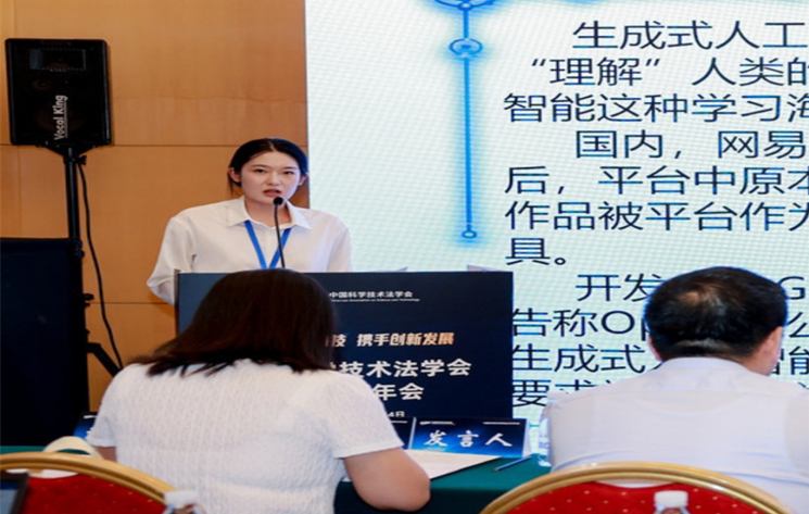 本次会议的主题是“法治护航科技,携手创新发展”,并设“科技法学基本理论、科技法学建设与科技伦理”“人工智能的法律治理与产业实践”“新兴领域治理与创新体制”“数据治理的理论与实践”“平台经济发展与算法监管”“科技成果的保护与转化”“科技产业发展的理论与实践”“生物医药创新的法律治理”八个分论坛。高玉洪同学在第四分论坛发言,分析了生成式人工智能大模型训练过程中数据“投喂”行为存在的著作权侵权风险,并强调数据“投喂”行为存在侵权事实难以查明、侵权责任主体难以确定以及侵权责任难以落实的三重困境,指出为有效规制数据“投喂”行为,应当确定侵权的过错推定原则、创设技术性授权机制以及引入“机器遗忘”的强制性规范。