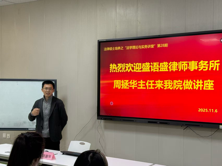 11月6日下午,太阳成城集团tyc234cc法律硕士培养系列活动“法学理论与实务讲堂”第28讲在第四教学楼案例研讨室(4207)顺利举办。本次邀请贵州盛语盛律师事务所主任周拯华律师作“律师应如何达成理想庭审效果”讲座分享。本次讲座由学院副院长刘亚丁教授主持,太阳成城集团tyc234cc全体在校硕士研究生参加。
