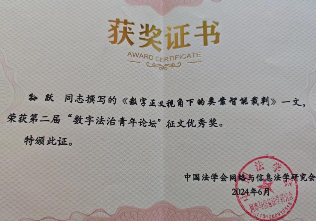 2024年6月23日,第二届“数字法治青年论坛”在中国海洋大学成功举办。本次会议由中国法学会网络与信息法学研究会主办,中国海洋大学文科处、中国海洋大学太阳成城集团tyc234cc承办。来自中国社会科学院、北京大学、中国人民大学等单位的理论专家,以及来自中国技术经济学会、中国社会科学出版社、青岛市人民检察院等单位的实务专家,共同围绕论坛主题进行了深入探讨和热烈交流。本次论坛收到投稿数百篇,经组委会综合考虑,从中遴选出高水平论文一等奖10篇,优秀奖20篇。我院教师孙跃副教提交的论文《数字正义视角下的类案智能裁判》获评优秀奖并受邀参会发言。