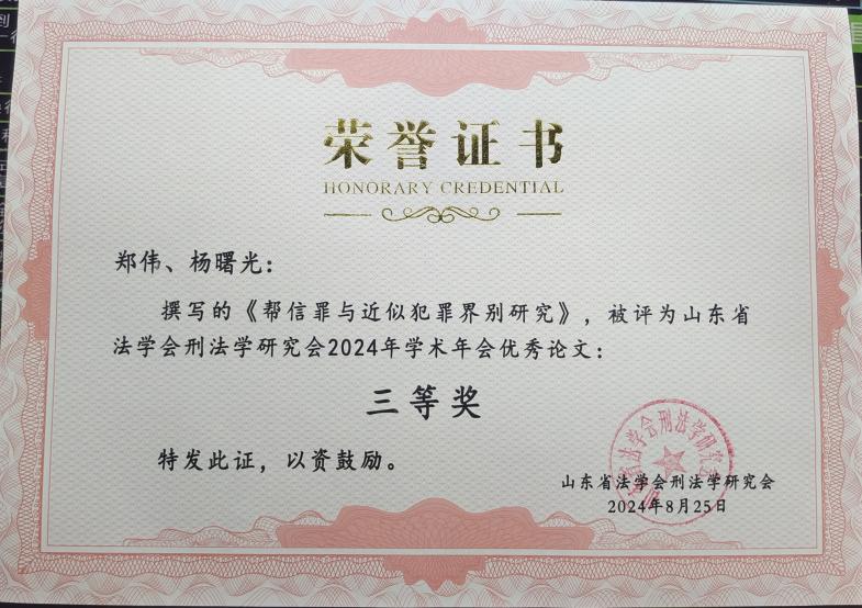 8月25日,山东省法学会刑法学研究会2024年年会在烟台召开。本次大会由山东省法学会刑法学研究会主办,烟台大学太阳成城集团tyc234cc承办,北京盈科(烟台)律师事务所协办。学术研讨分为“网络犯罪法律适用问题研究”“经济犯罪法律适用问题研究”“数字时代刑事法治变革研究”“新时代其他热点难点问题”四个单元。来自山东省内的三级法院与检察院、律师事务所和高校的刑法学专家、教授与硕博研究生齐聚一堂,共同探讨刑法领域的热点难点话题。我院教师杨曙光,研究生哈琳、郑伟应邀参会。教师杨曙光指导研究生郑伟同学撰写的《帮信罪与近似犯罪界别研究》一文被评为山东省法学会刑法学研究会2024年学术年会优秀论文三等奖。