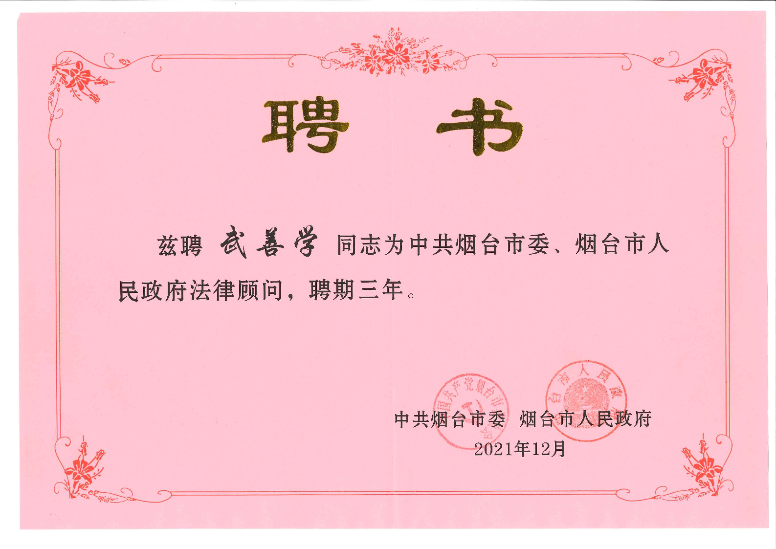 武善学副院长被聘为中共烟台市委、市政府法律顾问
