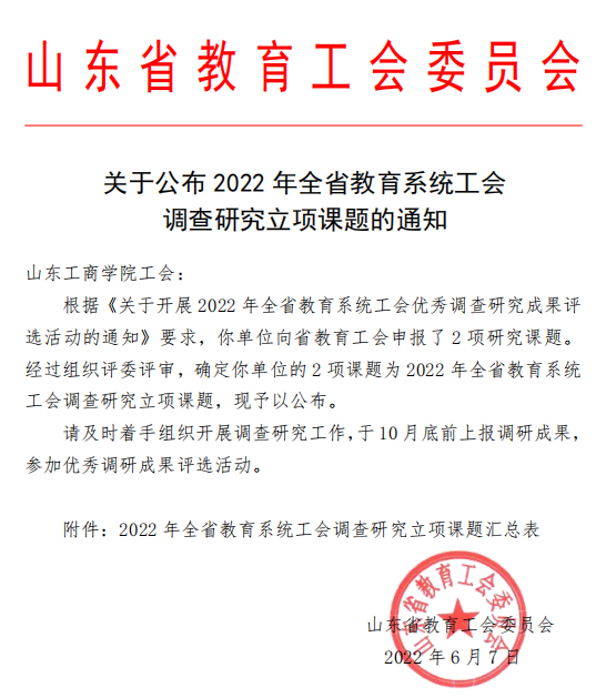 近期,山东省教育工会委员会公布2022 年全省教育系统工会调查研究课题立项名单,太阳成城集团tyc234cc分工会申报的《新时代高校工会职工思想政治引领工作研究》(JYGHKT2022051)获批立项。