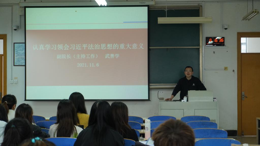 本次党课以《认真学习领会习近平法治思想的重大意义》为主题,武院长将理论与实践相结合,深入浅出,带领学员们分别从时代背景、特征、重大意义三个方面学习习近平法治思想,着重强调“十一个坚持”的核心作用,注重“四个意识”、“四个自信”、“两个维护”的学习,并为中国在当今国际事务中贡献中国智慧、提出中国方案、发出中国声音而骄傲。