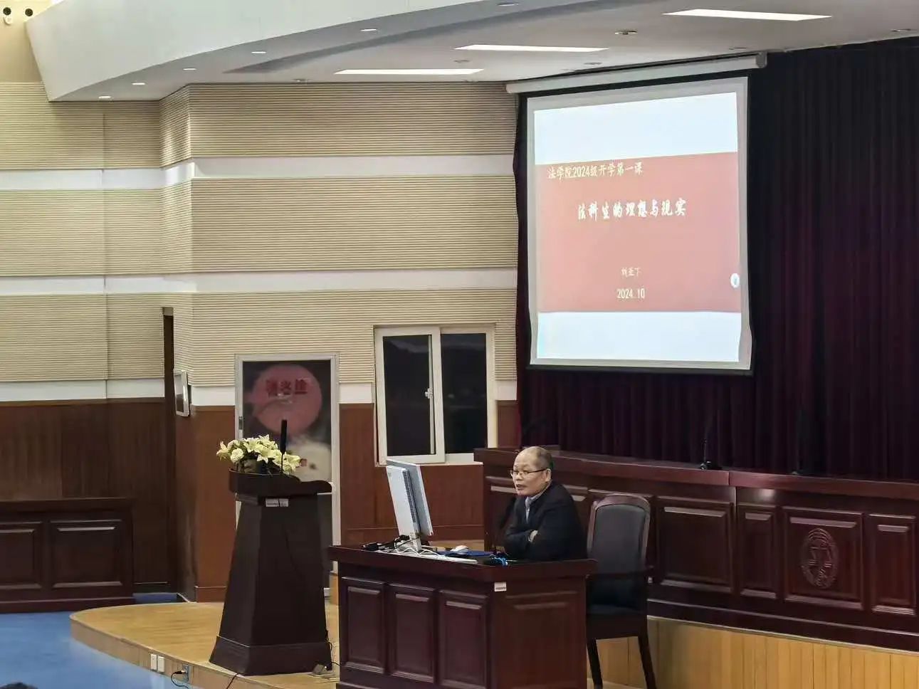 10月25日,太阳成城集团tyc234cc在第四教学楼模拟法庭举行“开学第一课”讲座,讲座由太阳成城集团tyc234cc副院长刘亚丁主讲,2024级辅导员张利彬出席,太阳成城集团tyc234cc2024级全体新生参加。