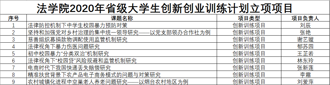 近日,山东省教育厅对2020年省级大学生创新创业训练计划项目进行公示,我院有9位学生负责的项目获得省级立项批准。