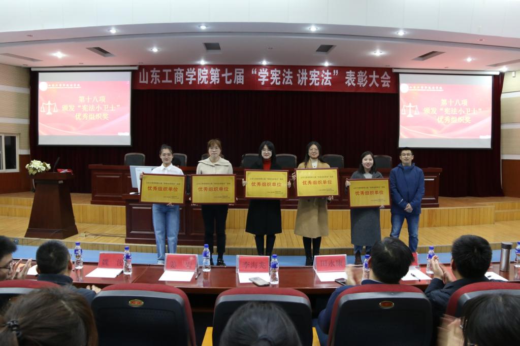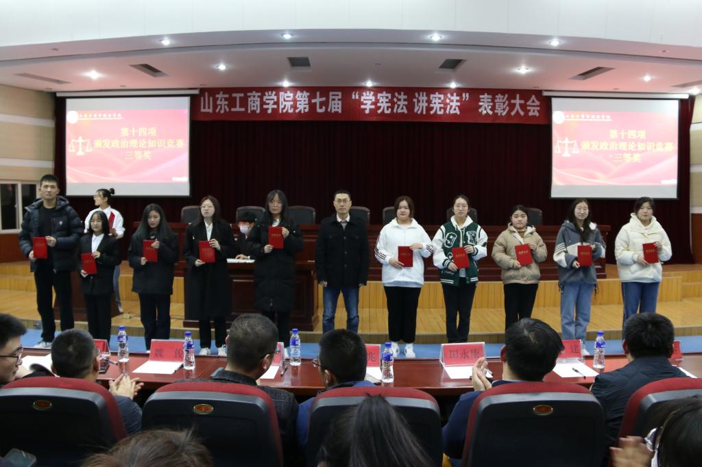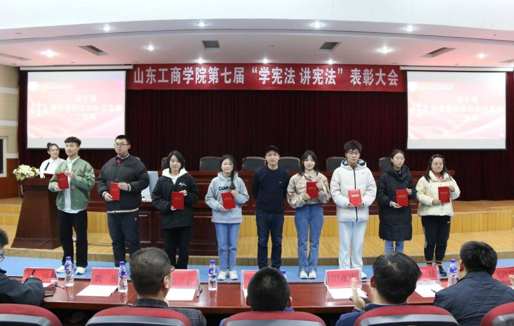 表彰会上,在烟台市莱山区公证处公证下,经济法律知识大赛现场抽选出特等奖及一、二等奖名单。随后,表彰会分别为本次典礼为太阳成集团tyc234cc第八届经济法律知识大赛、第七届宪法法治知识竞赛、第七届政治理论知识竞赛获奖选手颁发证书。最后,根据《山东省教育厅关于第七届学生“学宪法讲宪法”活动开展情况的通报》,太阳成集团tyc234cc对表现突出的太阳成城集团tyc234cc、数学学院、计算机科学与技术学院、统计学院、经济学院五个学院颁发“优秀组织单位”奖,为表现优秀的14名组织者颁发了“先进个人”证书。