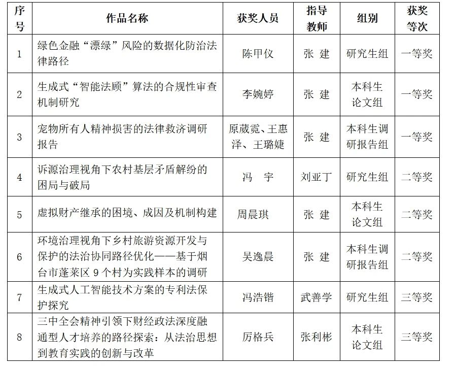 在法律职业技能大赛中,我院学生共获得8个奖项,其中一等奖3项、二等奖3项、三等奖2项,获奖数量及层次名列前茅。4名教师获得优秀指导教师,我院获得优秀组织奖。