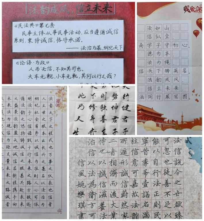 5月25日至27日的主题书法活动中,学生从经典法律名言、诚信典故中取材,以楷书、行书、隶书等形式,将法治与诚信精髓凝于笔端,实现文化传承与价值塑造的结合。