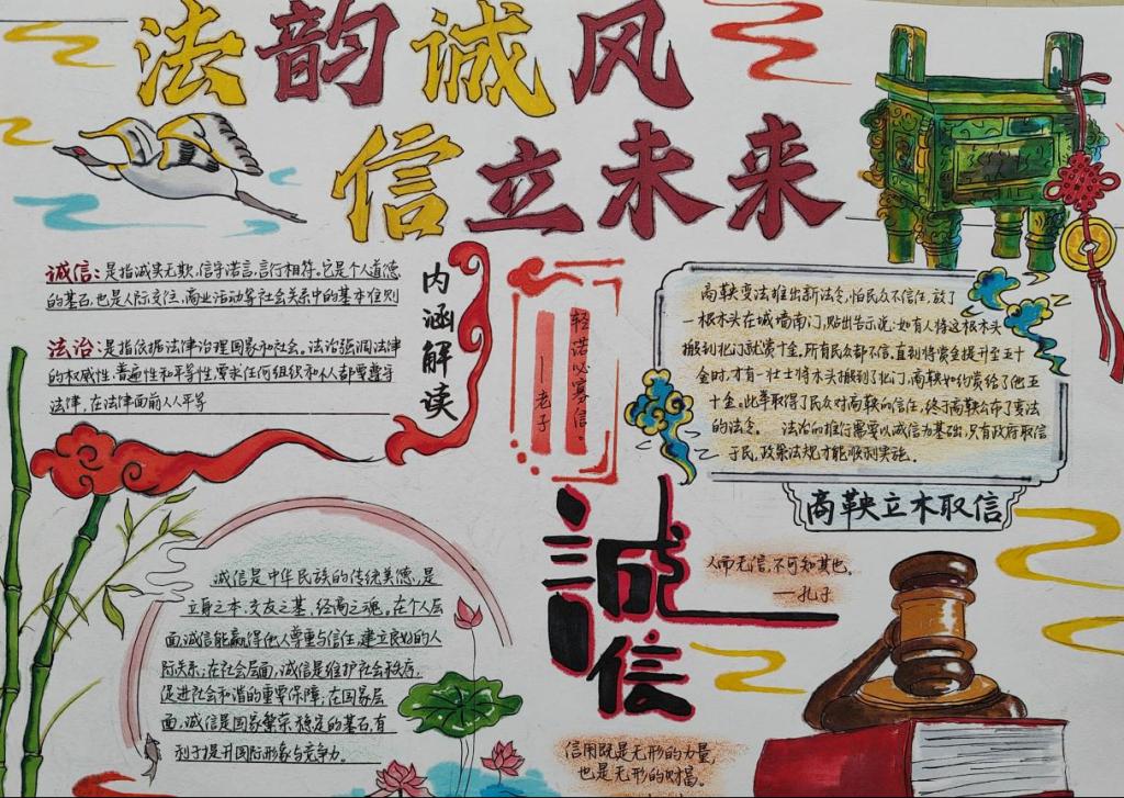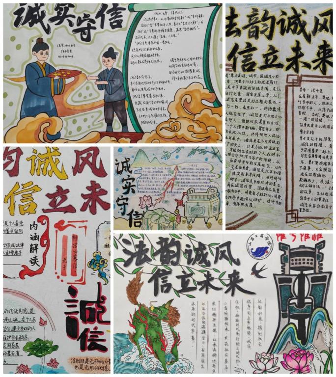 5月25日至27日,太阳成城集团tyc234cc举办“法韵诚风,信立未来”手抄报创作活动,面向全校征集作品。学生查阅法律知识与诚信案例,通过多样版面设计与图文搭配,呈现法治与诚信的联系,展现出扎实创作功底与独特创意,加深了对法治和诚信的认识。